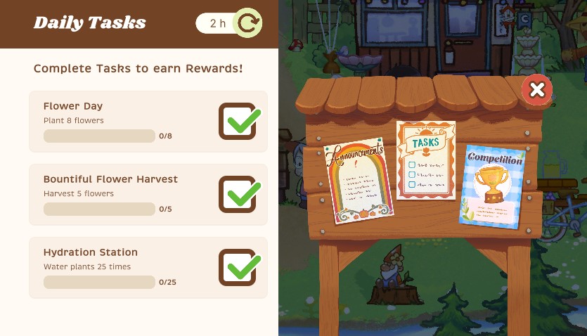 Grandma Green has daily/weekly tasks that reward the player with money, seeds or garden decorations when completed. Tasks are tracked on the Bulletin Board in the town square, and ask the player to perform common actions like watering plants, tilling grass or selling harvested plants on the market.