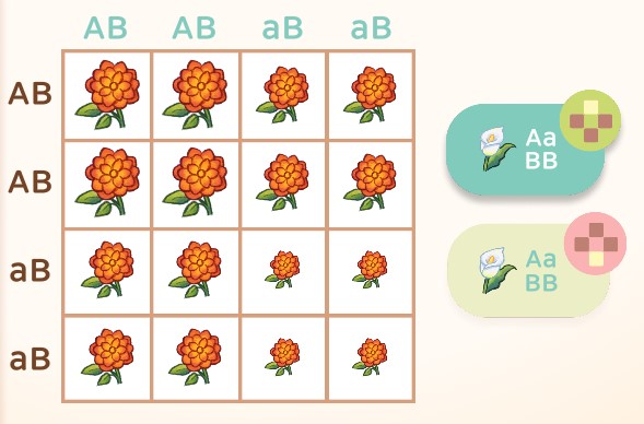 In Grandma Green plants can be crossbred with a simplified Mendelian inheritance system. Every plant has a genotype that encodes two traits. The first trait [Aa] for all plants is the size of the plant, where aa is medium, Aa is medium, and AA is large. The second trait [Bb] is unique to each plant type - for flowers it is color, for fruits it is variety, for vegetables it is the length. When a plant is harvested one of its cardinal neighbors is randomly selected for crossbreeding, then a random coordinate on the square is selected that determines the genotype of the harvested seeds.